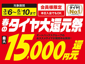 クルマのことならスーパーオートバックス岐阜へ! ウェブサイト・電話で ピット作業予約ができます! 車検のこと・法定12ヶ月点検のこと、なんでもご相談ください! 多彩なピットメニューで 愛車をケアして快適ドライブ! クルマの買取・販売、 おまかせください! キャンペーン 2026年 春のタイヤ大還元祭 – オートバックスはタイヤが安い!サイズに応じて最大15,000円還元 3月6日(金)から5月10日(日)まで実施 購入サイズに応じて最大15,000円還元!2026年春&ゴールデ マジカルヒューズ店頭販売イベント2026 – 愛車の燃費と走りの不満を解消!車本来の性能を取り戻すスペシャルパーツ 3月21日(土)・3月22日(日)に実施 走り・燃費・音質・光量など電気に関わる部分をクルマ本来の性能に!ノ 2026年春 ドライブレコーダー・電子ミラー大還元祭 – オートバックスなら対象機種購入で最大10,000円還元! 2月20日(金)から5月10日(日)まで実施 対象機種購入で最大1万円還元!春&ゴールデンウィークのドライブ 2026年春 カーナビ大還元祭 – オートバックスならカーナビの購入金額に応じて最大7万円還元! 2月20日(金)から5月10日(日)まで実施 購入金額に応じて最大7万円還元!春&ゴールデンウィークのドライ クルマを売っていただいた方に最大10万円分のギフトカードプレゼント – 2026年1月・2月・3月 オートバックスでのクルマ売却がお得! 1月17日(土)から3月8日(日)まで実施 愛車を売るなら今がお得!オートバックスはクルマを買い取らせていた 2025年-2026年 オートバックスヒートアップキャンペーン – Tune&Dress up スポーツパーツが安い! 2026年3月31日(火)まで実施中 2026年3月31日(火)までメーカー希望小売価格から最大45%OFF 安全点検を無料で実施しています いつでも無料で実施 安心・快適ドライブのためにドライブ前/後にオートバックスで安全点検をしましょう! オート キャンペーン一覧 特集 12ヶ月点検は法律で定められている必須点検です 「CARFUN」クルマに関する知識や話題のトピックスを紹介 商品情報 ブリヂストン ALENZA LX200 – 上質なドライビング体験を提供!なめらかな走行を実現するSUV向けプレミアムタイヤ 静けさと、なめらかさと。心地よさに包み込まれる。ロードノイズを従来品対比16%低減、上質なドライビング体験を ブリヂストン プレミアムコンフォートタイヤ・フィネッサ – 雨天でもしっかり止まる・曲がる安心感!多様化するカーライフに応える新ブランド・FINESSA登場 雨のち、フィネッサ。タイヤがすり減っても雨の日のあらゆるシーンでしっかり「止まる・曲がる」を実現、家族を乗せ ブリヂストン スポーツタイヤ・ポテンザシリーズ – 走りへのこだわりを追求!ツーリングやスポーティードライビングの楽しさを追求するスポーツタイヤ 「ストリート最速を追求したリアルスポーツ」「コンフォート性能にも配慮したプレミアムスポーツ」「幅広い車種に対 2025年-2026年おすすめのタイヤチェーン – 今シーズンはコレ!雪道や凍結路で圧倒的なグリップ力を持つタイヤチェーン 降雪時の寒い場所で、素早く、ラクに、確実に装着可能!雪道や凍結路で圧倒的なグリップ力を持つタイヤチェーンは冬 2025年-2026年スタッドレスタイヤ新製品 – 今シーズンはコレ!おすすめの冬タイヤ情報 凍結路面・雪上路面で安定走行!オートバックスでは、軽自動車・普通車からミニバン・SUVまで様々な種類・サイズ オートバックスはタイヤが安い! – 低価格のプライベートブランドタイヤ 軽自動車からミニバン・商用車向けまで!輸入タイヤから国産タイヤまで!オートバックスはプライベートブランドタイ 2025年 厳選!夏の日差し対策サンシェード – 今年のトレンドは傘型サンシェード!車内の温度上昇を和らげるお手軽アイテム 「暑い」「熱い」「しばらく出発できない」を解消!オートバックスでは車内の温度上昇を和らげるお手軽アイテム・サ 2025年 厳選!クルマの中でも扇風機 – エアコンの直風は苦手!カーファンはやわらかな風で快適に涼しさをアップします 「エアコンの冷気や直風が苦手」な方へ!オートバックスではやわらかな風で快適に涼しさがアップする車内用の扇風機 [車検制度改正] 2025年4月以降 車検満了日の「2ヶ月前」から車検を受けられます 車検の受検可能期間がこれまでの「車検満了日の1ヶ月前」から「車検満了日の2ヶ月前」に!繁忙期を避けて余裕を持 突然やってくるバッテリー上がりを予防 – クルマのトラブル原因NO.1!バッテリーは消耗品です 無料点検をご利用ください!バッテリー上がりを予防して安心ドライブ。バッテリー交換も経験豊富な整備士がいるオー 商品情報一覧 新着情報 2026.03.03 2026年 春のタイヤ大還元祭 – オートバックスはタイヤが安い!サイズに応じて最大15,000円還元 2026.02.26 マジカルヒューズ店頭販売イベント2026 – 愛車の燃費と走りの不満を解消!車本来の性能を取り戻すスペシャルパーツ 2026.02.26 ブリヂストン ALENZA LX200 – 上質なドライビング体験を提供!なめらかな走行を実現するSUV向けプレミアムタイ