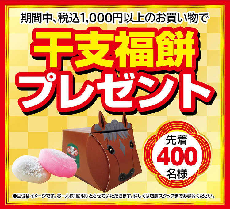 新春初売り、ご来店・ご購入のお楽しみ!2026年1月3日(土)から2026年1月7日(水)まで、税込1,000円以上購入のお客様・先着400名様に干支福餅をプレゼントします。