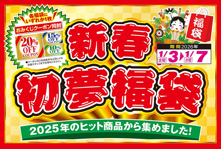 皆様が楽しみにしている毎年恒例の福袋!2026年の初夢福袋は2026年1月3日(土)午前10時から店舗で販売します。数量限定につき、希望者多数の場合は整理券を発行させていただく場合があります。
